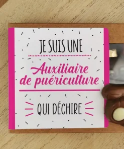 – Packaging : Boîte cartonnée avec fenêtre plastifiée et autocollant avec l’inscription je suis une auxiliaire de puériculture qui déchire aux couleurs rose