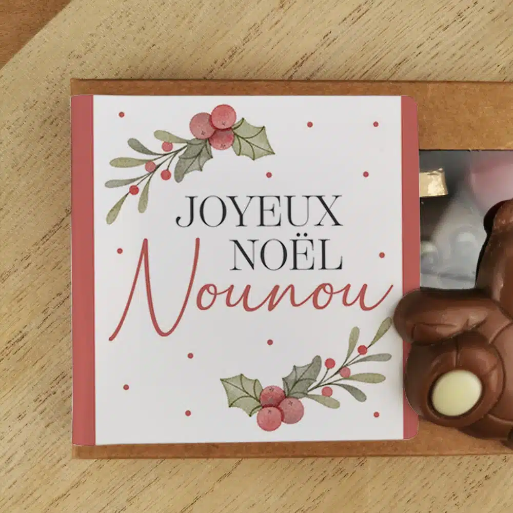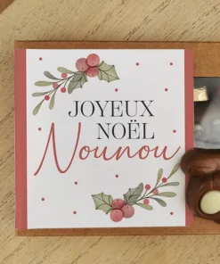 – Packaging : Boîte cartonnée avec fenêtre plastifiée et autocollant avec l’inscription Joyeux Noël Nounou aux couleurs vert et rouge