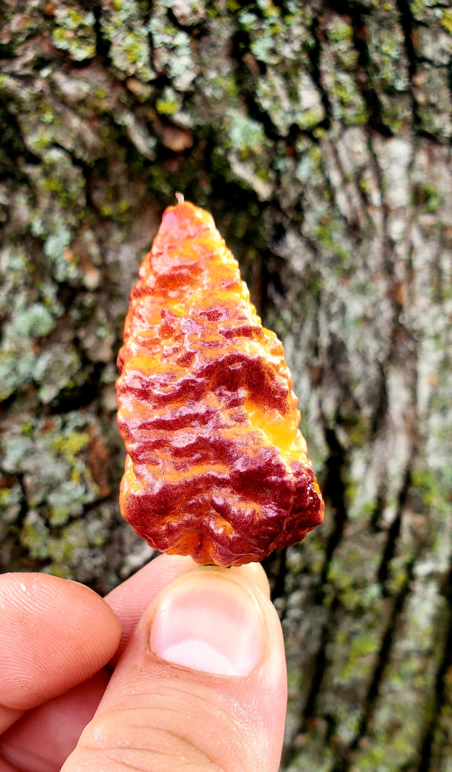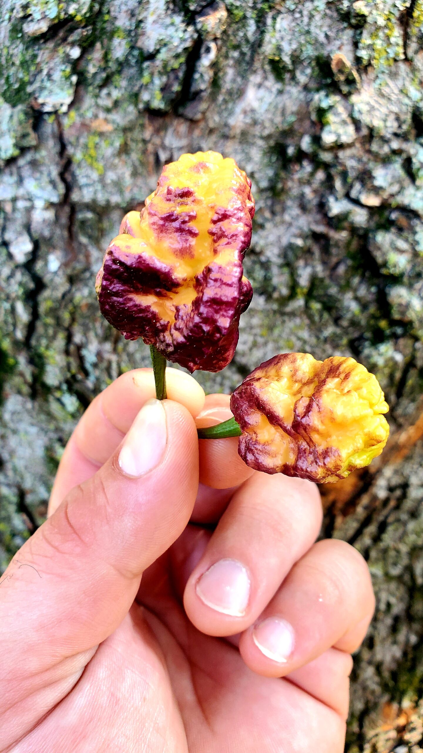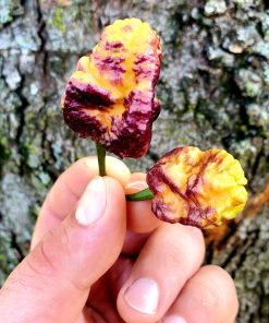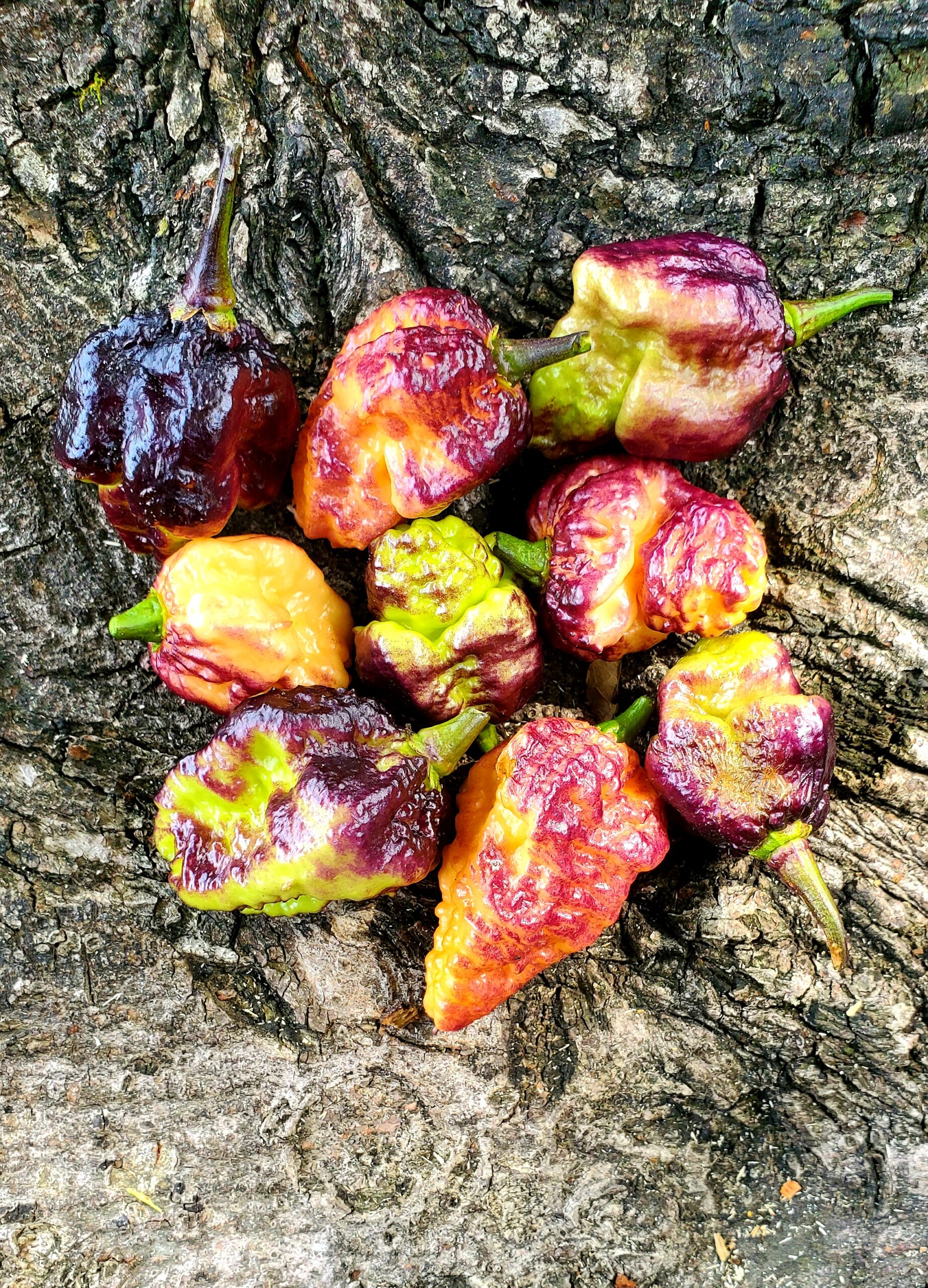 Le Piment Pockmark Peach, résulte de la hybridation du Bhut Jolokia et du Pimenta De Neyde. Il existe plusieurs variantes de ce piment. Le nom de ce piment est lié à ses taches noires ou violettes sur la couleur pêche sous-jacente, qui peuvent disparaître à maturité complète. Ce piment est très varié en apparence, avec des formes allongées de type naga ou rondes et une surface bosselée ou quasi-lisse. Proche du Ghost en termes de force, avec une saveur fruitée et terreux doux, certains le décrivant comme fumé. La taille des gousses varie considérablement selon les conditions de croissance, allant d’un centime à une balle de golf.