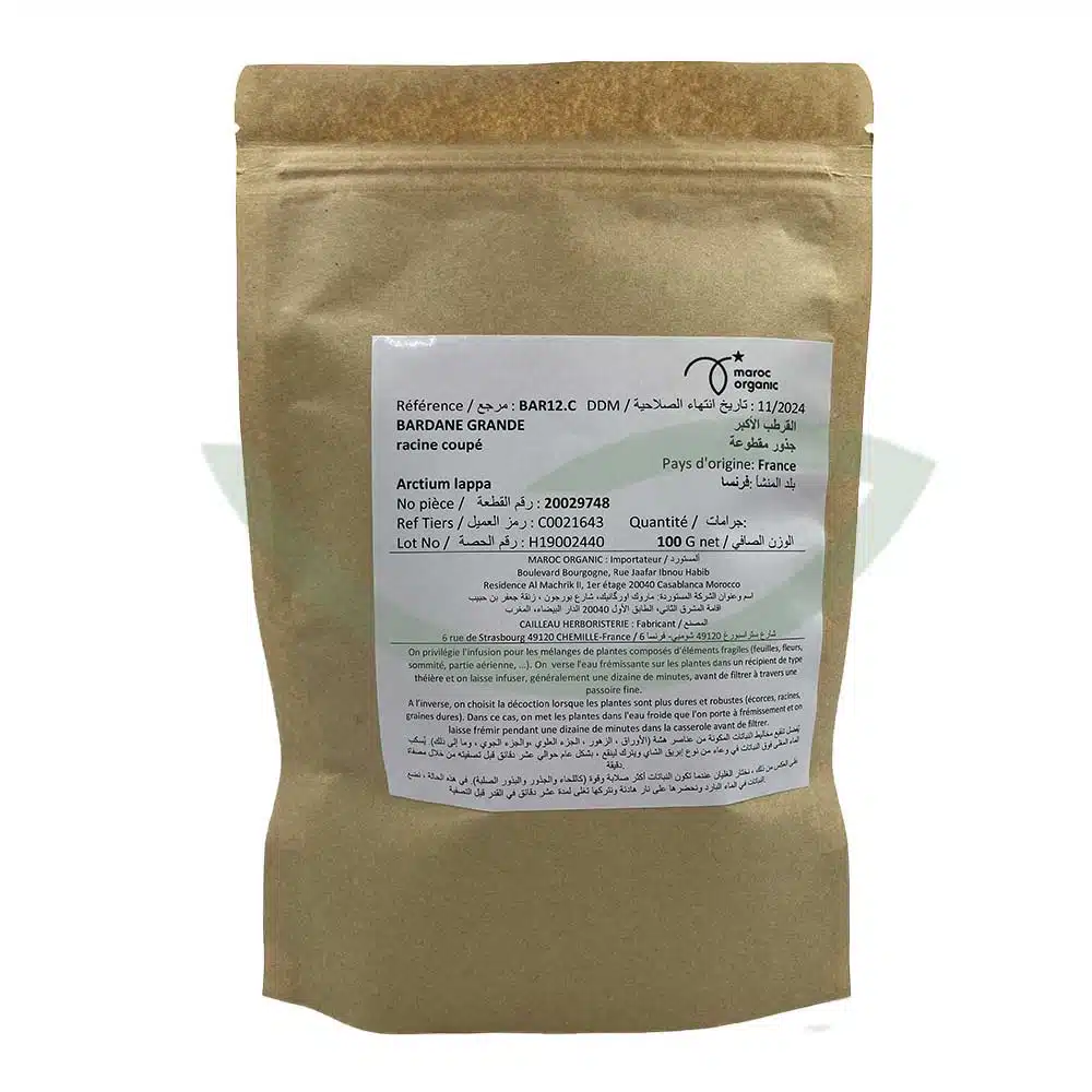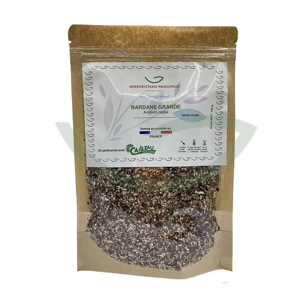 Caractéristiques de la Plante Médicinale Bardane Grande Arctium Lappa Racine coupée 100g de l’Herboristerie Principale