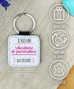 Voici une idée pratique pour la fin de l’année scolaire : Le design de ce porte-clé spécial la fin de l’année scolaire en similicuir est parfait ! Avec ses dimensions de 5 x 5 cm et son poids léger de 12g, ce porte-clé est facilement transportable, il est parfait en tant que porte cléclé de voiture ou de maison. Son motif je suis une auxiliaire de puériculture qui déchire en rose est parfait pour la personne à qui vous l’offrez. La couleur noire à l’arrière assure une finition élégante. L’impression est réalisée dans notre atelier en France, pour un résultat de qualité. Le porte-clé est également équipé d’un anneau en métal pour attacher facilement aux clés.