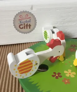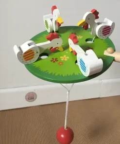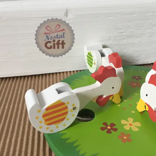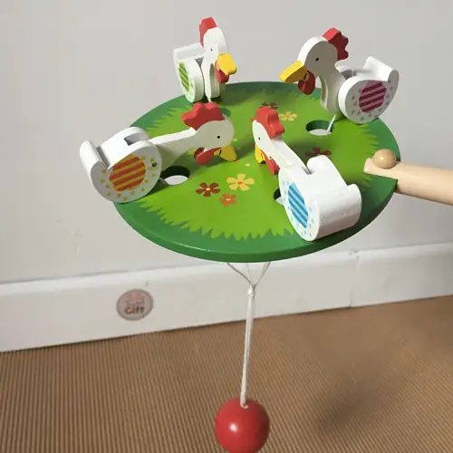 C’est un jouet traditionnel qui traverse les décennies. Faites tourner la boule pour voir les poules picorer !