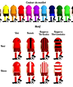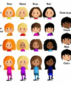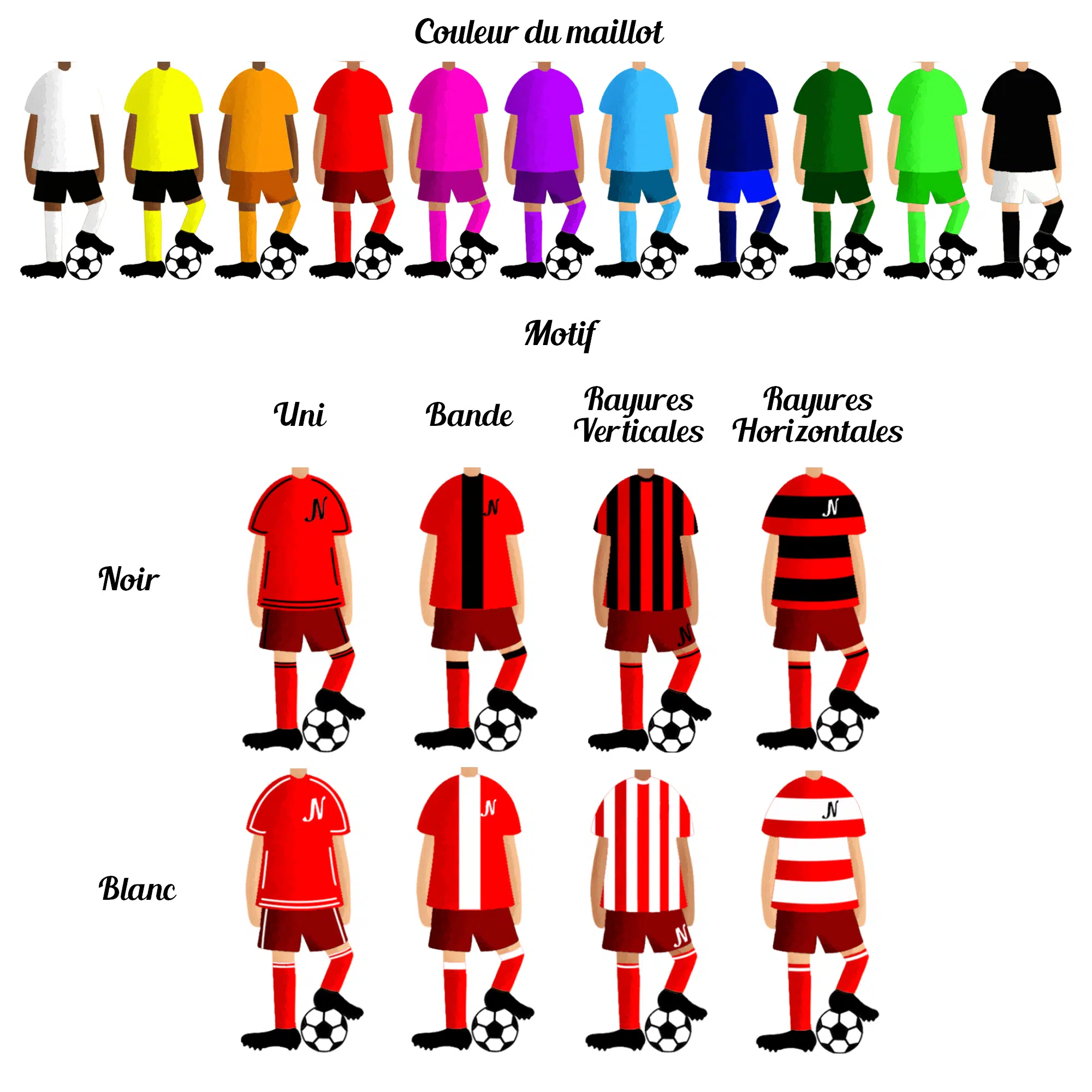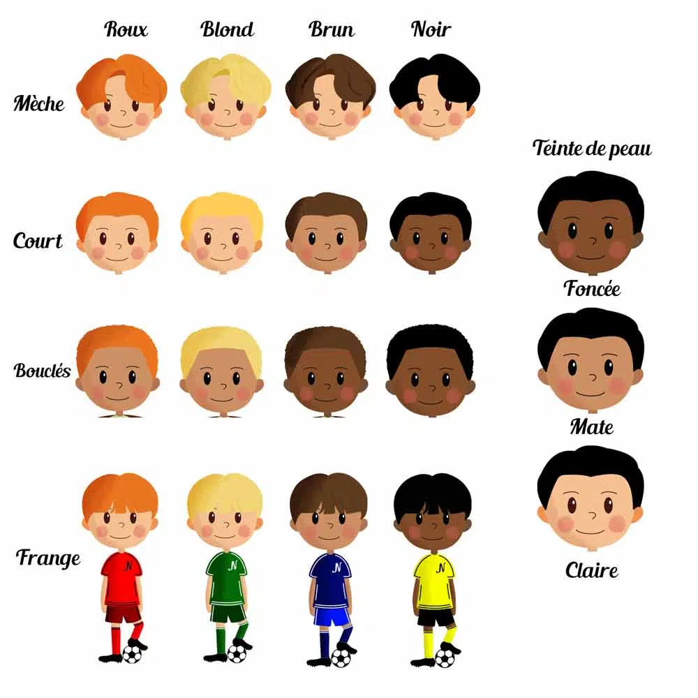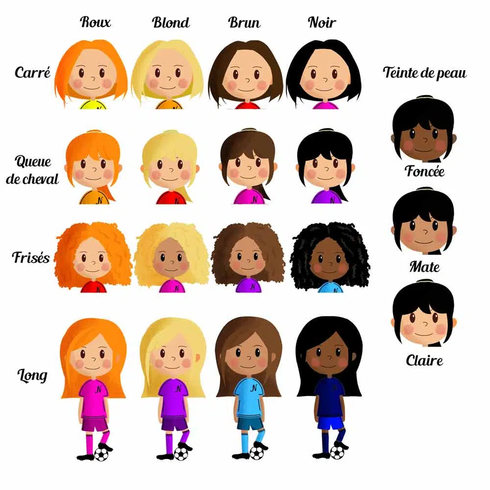 – Personnalisation : Prénom, couleur de peau, coupe de cheveux et maillot de foot (couleur et motif du maillot)