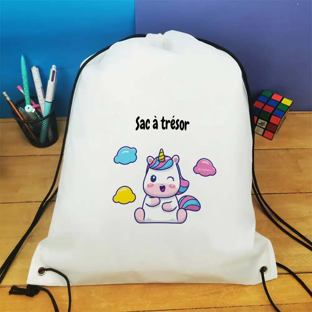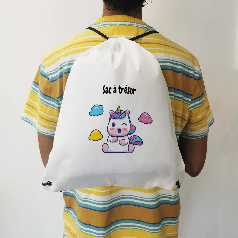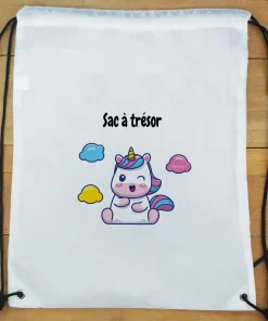 Sur ce sac de gym, il sera écrit “Sac à trésor” sur l’avant. En polyester et une fermeture facile grâce à ses cordons, ce sac est simple d’utilisation et ne craint pas l’eau qui pourrait couler de la gourde ou du maillot de bain.