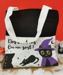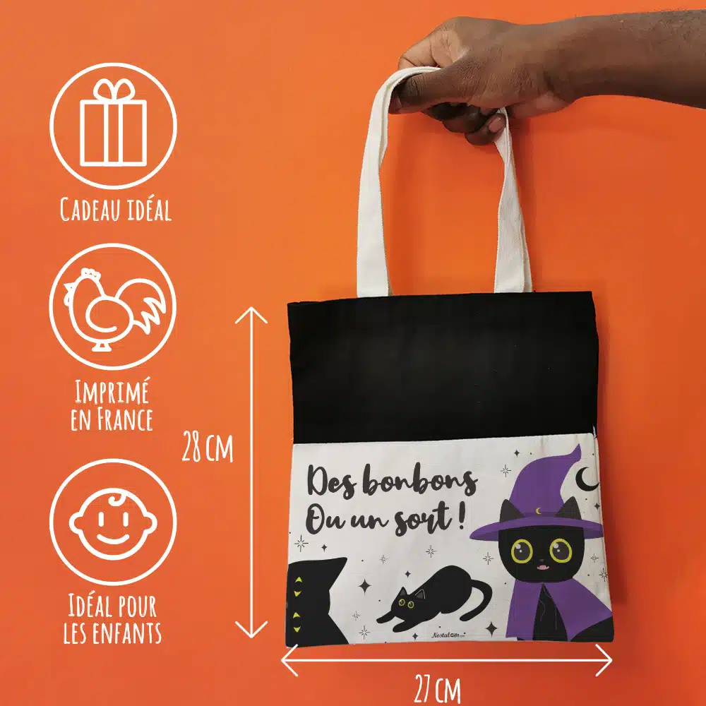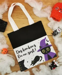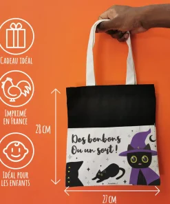 La chasse aux bonbons pour Halloween ne pourrait se passer de ce sac “Des bonbons ou un sort ” ! Votre enfant sera bien équipé avec ce très joli sac au design de chat noir N’hésitez pas à consulter nos bonbons Halloween pour remplir ce sac de douceurs !