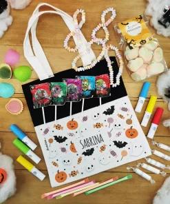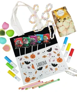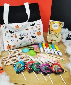La chasse aux bonbons pour Halloween ne pourrait se passer de ce sac personnalisé au prénom de votre enfant ! Votre enfant sera bien équipé avec ce très joli sac au design de citrouilles, chauve souris, bonbons, fantômes…et en plus il sera ravi de déguster nos meilleurs confiseries (Collier, roudoudou, sucette, sifflet, guimauve…). N’hésitez pas à consulter nos bonbons Halloween pour compléter ce sac de douceurs !