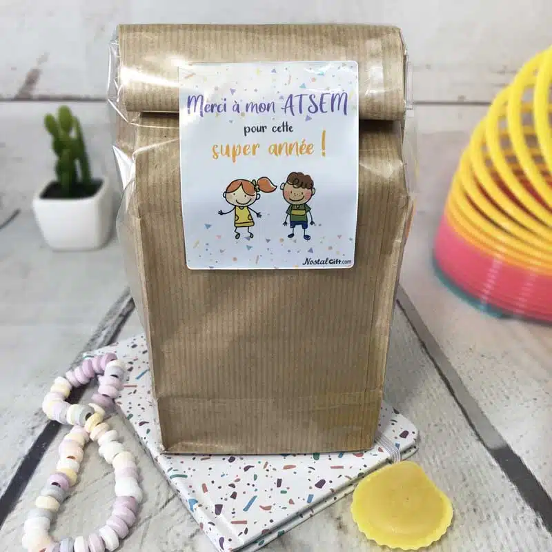 Un sachet de bonbon retro pour une atsem ? L’atsem de votre enfant va adorer ! Offrez ce cadeau original pour la fin d’années. Ce sachet de bonbon lui fera plaisir à coup sûr ! Faites-lui redécouvrir les saveurs d’antan avec des bonbons des années 80 !