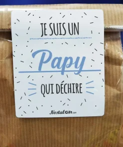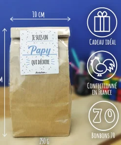 Offrez un cadeau original pour la fête des grands pères ou pour un anniversaire avec notre sachet bonbon, sur lequel est imprimé en France “Je suis un papy qui déchire” sur l’avant du sachet en Bleu .
