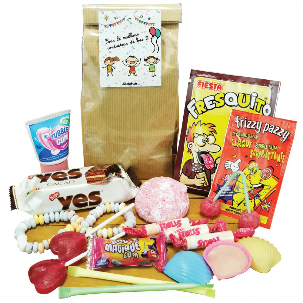 Contient : 1 Fresquito cola, 1 Frizzy Pazzy Fraise, 1 Gateau YES cacao , 1 Tubble gum tutti, 1 Collier bonbon dextrose, 2 Sucette en forme de coeur à la cerise, 2 Pailles poudre acidulée , 3 Fizzy Roll , 3 Roudoudou , 1 Sachet de 2 boules magiques, 1 boule coco
