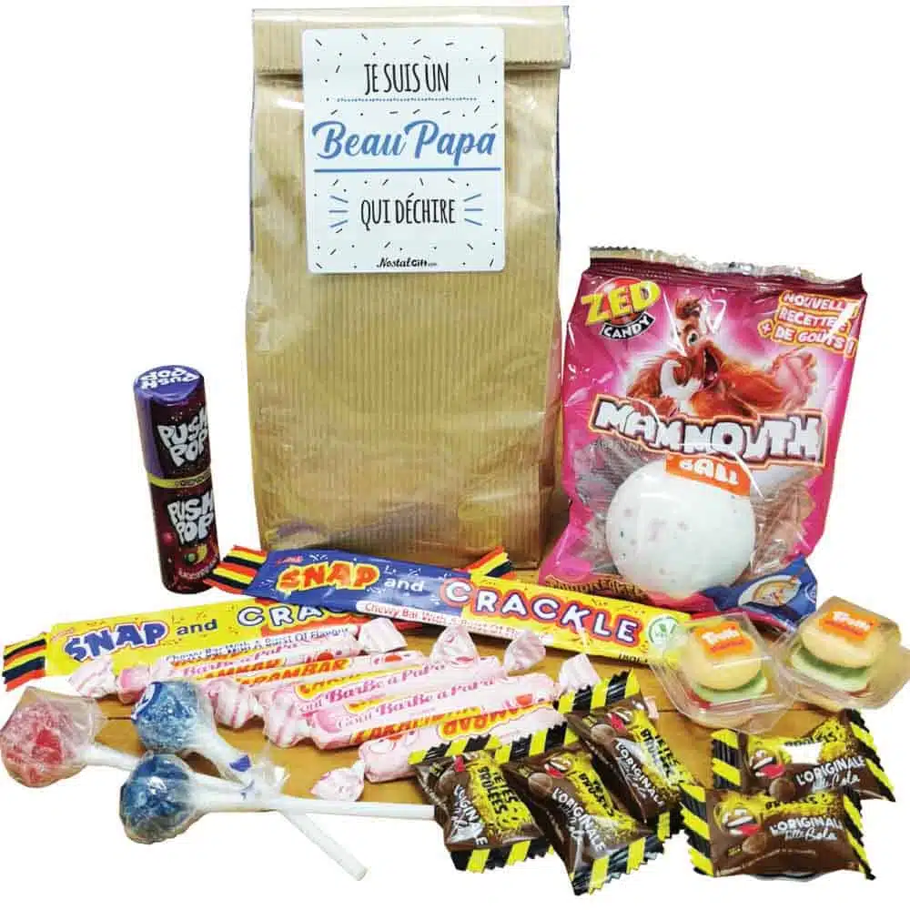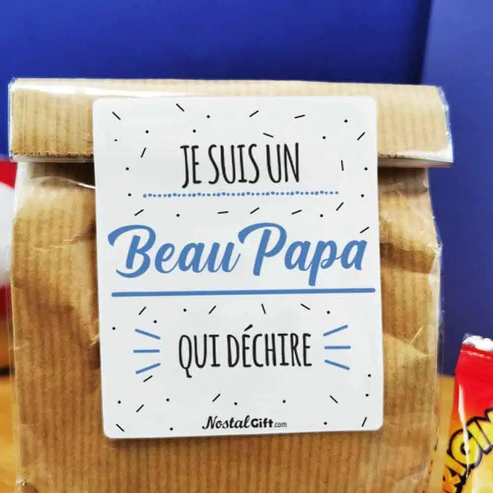 Offrez un cadeau original pour un anniversaire avec notre sachet de bonbons des années 1990, arborant “Je suis un Beau Papa qui déchire” sur l’avant du sachet.