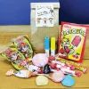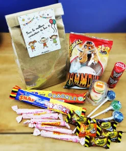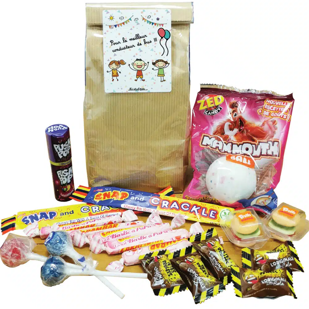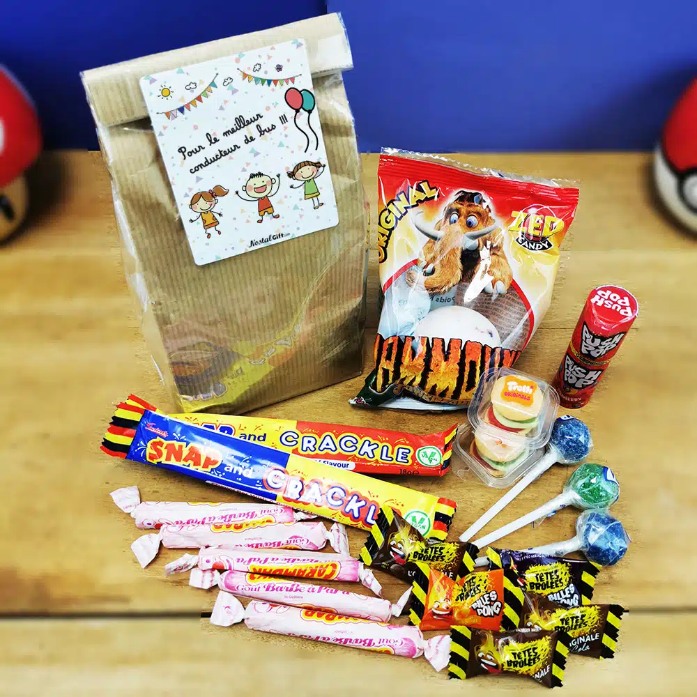 Contient : 5 têtes brûlées (gout aléatoire), 1 push pop (gout aléatoire), 3 sucettes tâche langue, 1 couille de mammouth, 2 mini Burger, 2 snap crackles, 5 carambar barbe à papa
