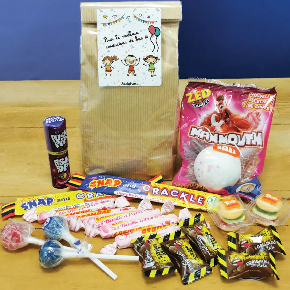 Ce sachet bonbon au joli design est disponible avec des bonbons 70 et 80 également et l’impression est réalisée dans notre atelier en France par l’équipe NostalGift.com pour une qualité irréprochable.