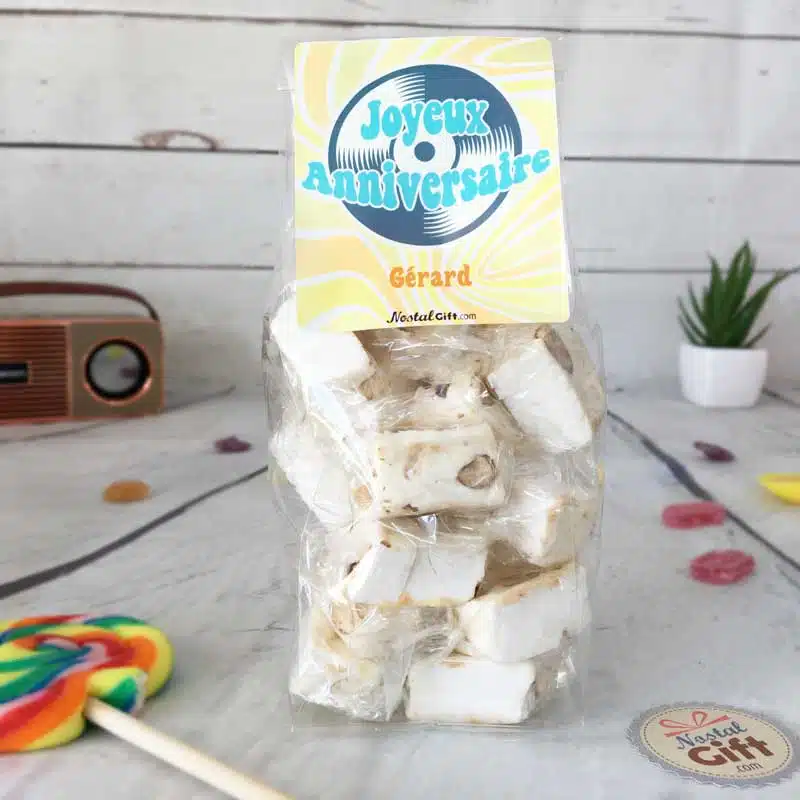 Sachet bonbons personnalisé années 70 – 15 nougats – “Joyeux anniversaire”
