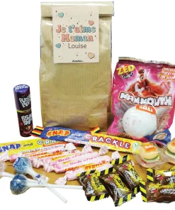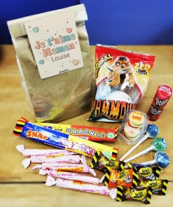 Un sachet de bonbon personnalisé des années 90 pour témoigner de son amour à sa mère ! Passez-vous du traditionnel bouquet et offrez ce paquet de douceurs pleins de souvenirs. Faites-la redécouvrir les saveurs acidulées et explosives des bonbons d’autrefois!
