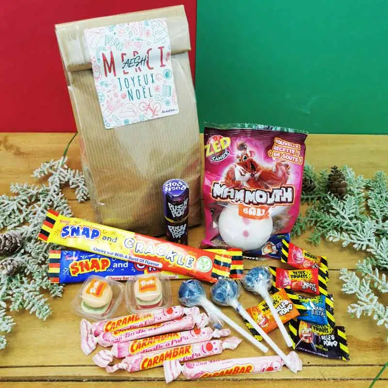 Et si on optait pour ce sachet de bonbons des années 90 pour l’AESH de votre enfant ? Et si on revivait les magies de Noël telles qu’on la vécu étant enfants ? Savourez ce moment grâce au contenu de ce sachet bonbons rétro. Retrouvez les saveurs des années 90 : Couille de mammouth, push pop, tête brulées…