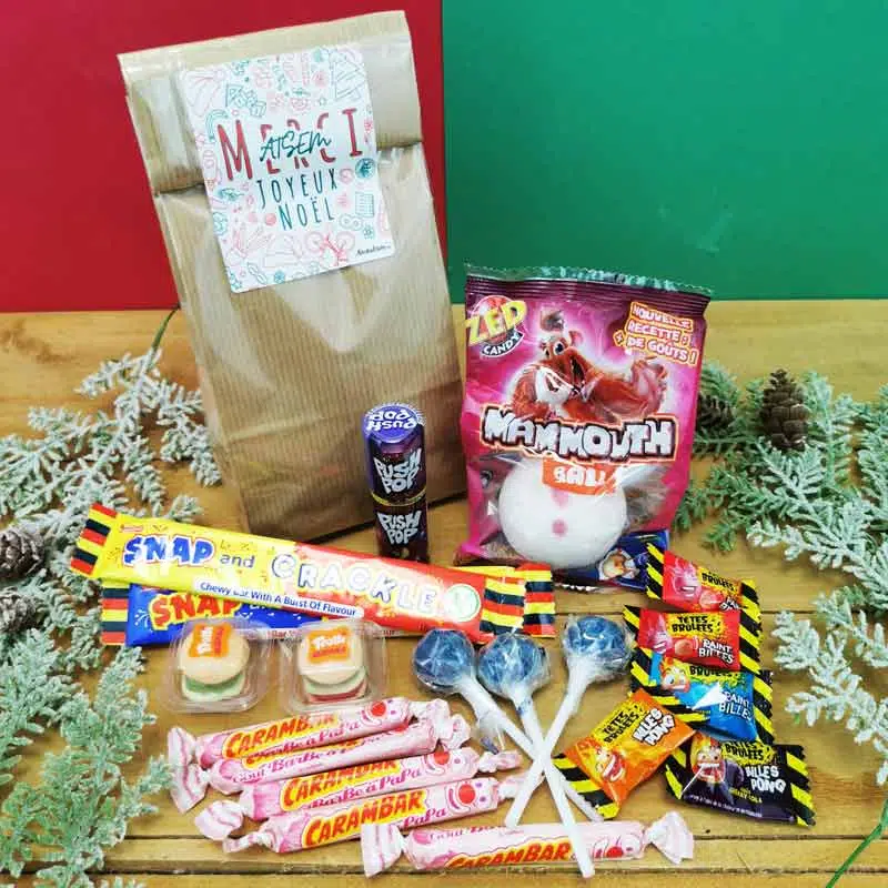 Et si on optait pour ce sachet de bonbons des années 90 pour l’ATSEM de votre enfant ? Et si on revivait les magies de Noël telles qu’on la vécu étant enfants ? Savourez ce moment grâce au contenu de ce sachet bonbons rétro. Retrouvez les saveurs des années 90 : Couille de mammouth, push pop, tête brulées…