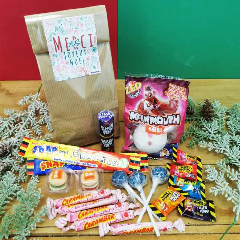 Et si on optait pour ce sachet de bonbons des années 90 pour l’AVS de votre enfant ? Et si on revivait les magies de Noël telles qu’on la vécu étant enfants ? Savourez ce moment grâce au contenu de ce sachet bonbons rétro. Retrouvez les saveurs des années 90 : Couille de mammouth, push pop, tête brulées…