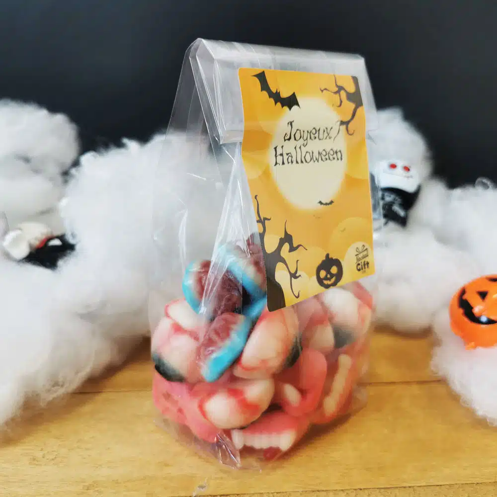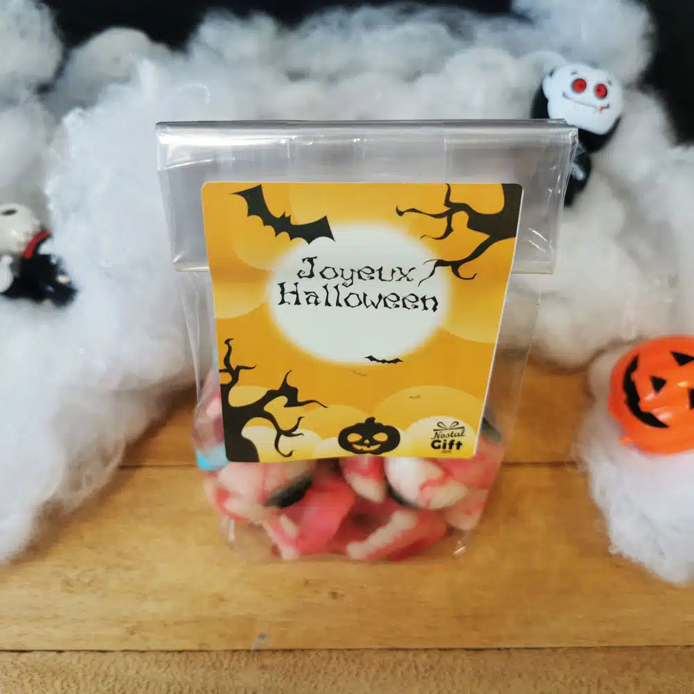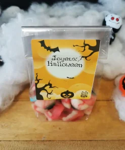 – Emballage : livré dans un sachet bonbon et une étiquette “Joyeux Halloween”
