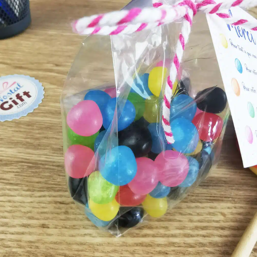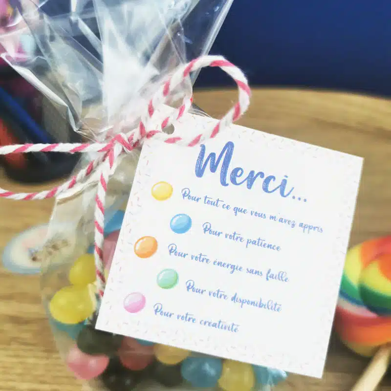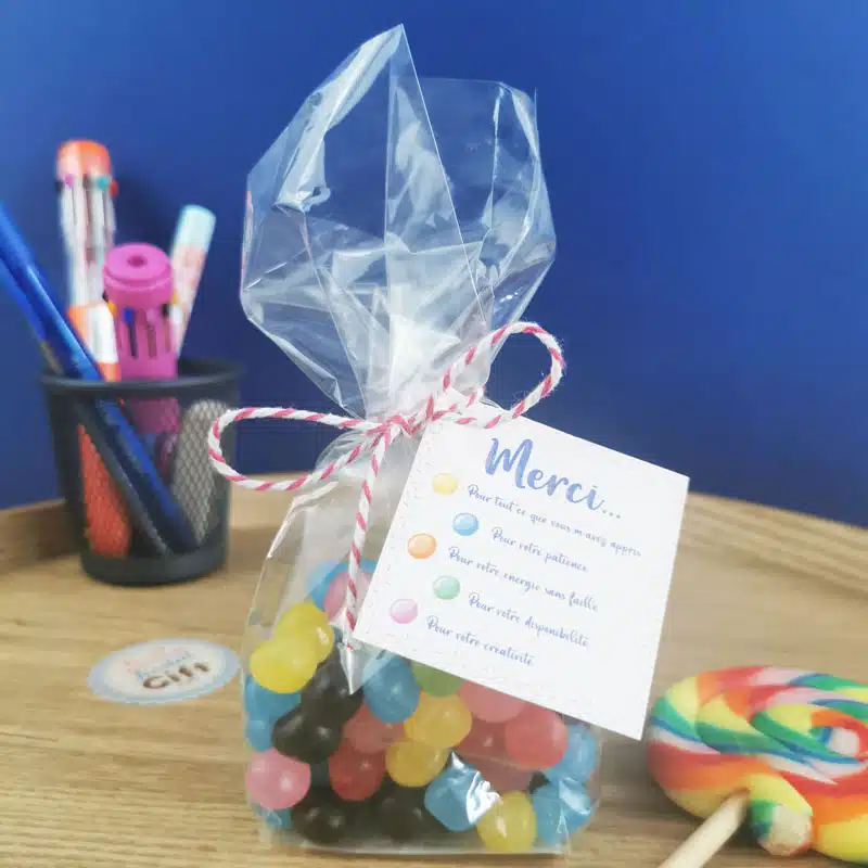 La maîtresse ou le maître de votre enfant a elle/lui aussi droit à son petit moment de plaisir. Ils ont passé une année à chouchouter votre enfant pour que son apprentissage se passe dans de bonnes conditions. Alors remercions-le avec ce sachet de bonbons colorés symbolisant tous les remerciement que nous pouvons lui faire. 1 couleur = 1 remerciement particulier. Les mentions sont : Merci