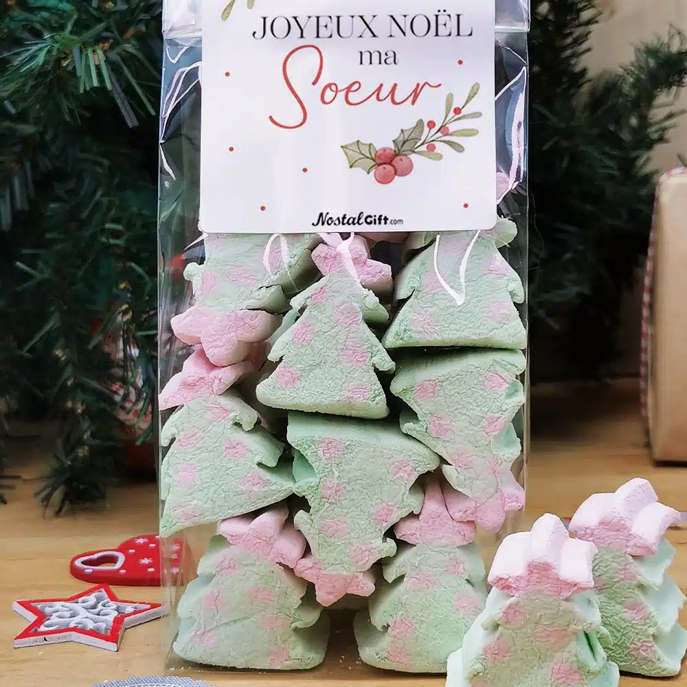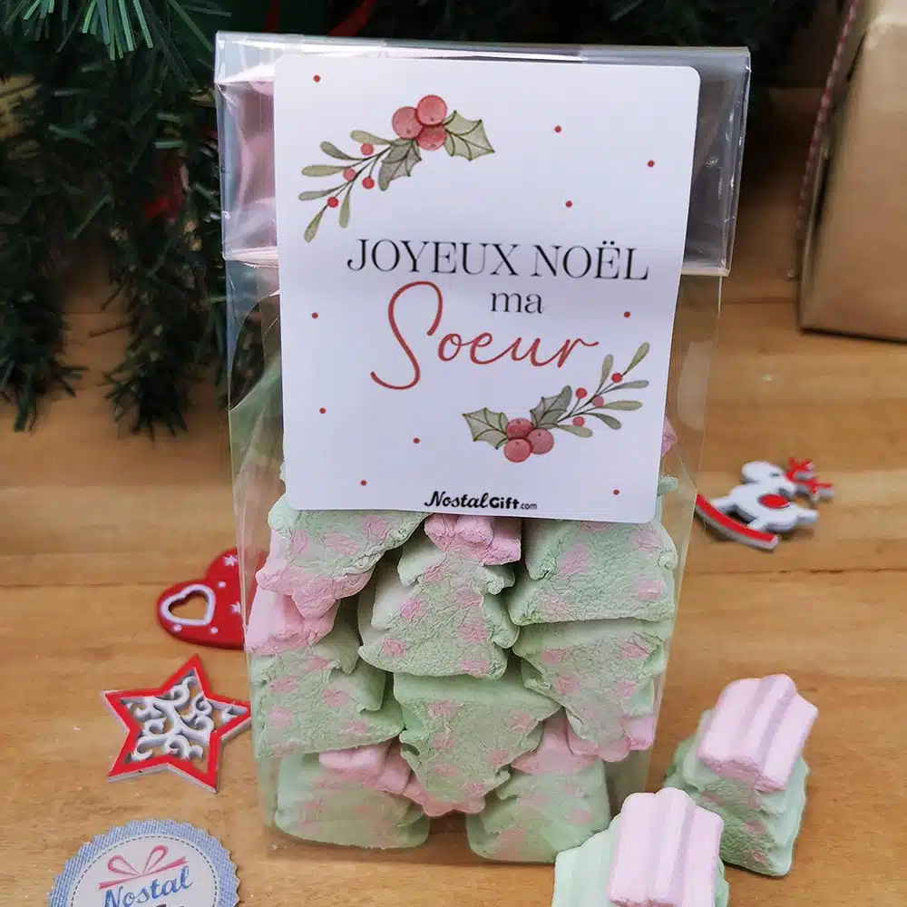 Sachet de guimauve sapin de Noël x 10 – “Joyeux Noël ma soeur” – Cadeau Noël