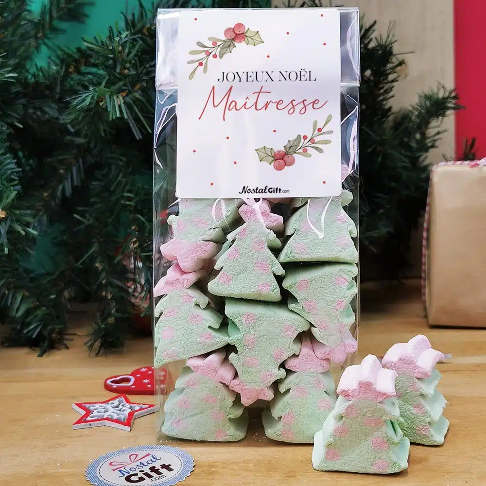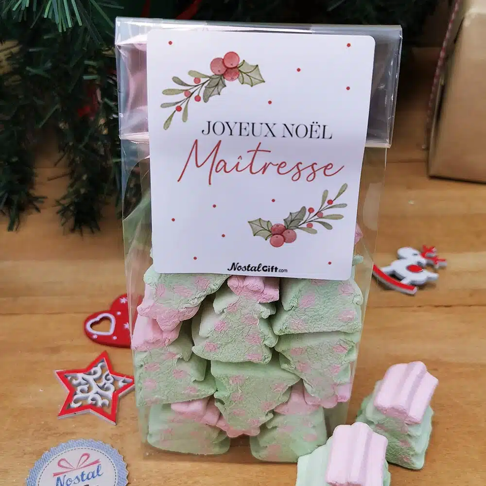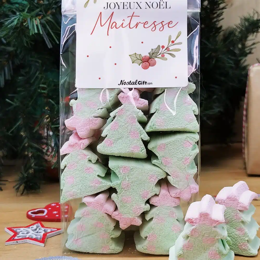 Sachet de guimauve sapin de Noël x 10 – “Joyeux Noël Maîtresse”
