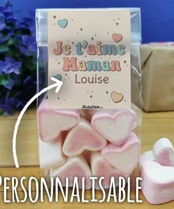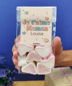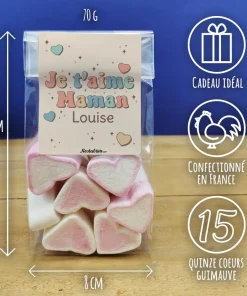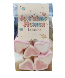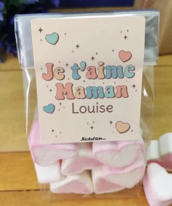 Sachet gros coeurs en guimauve x 15 – “Je t’aime Maman” – personnalisable