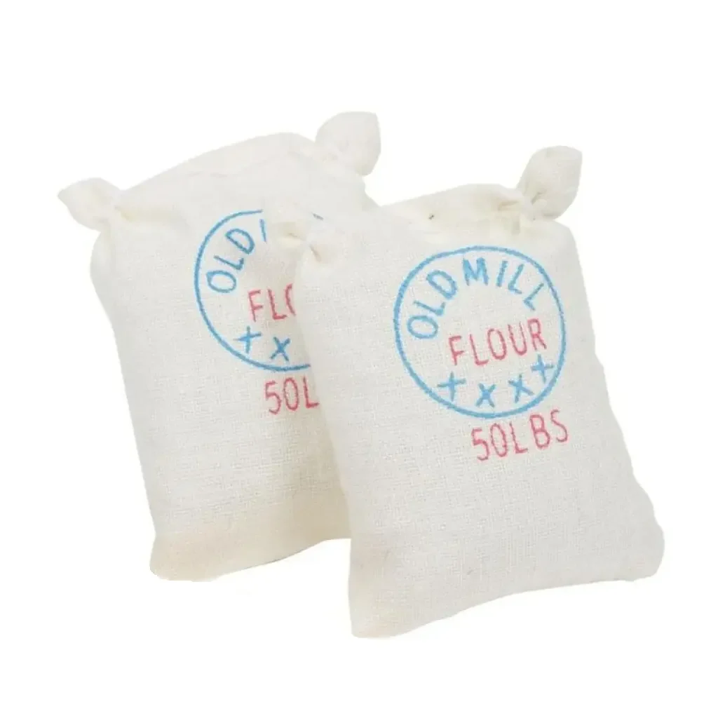 Chaque sac présente un visuel “Old Mill Flour” imprimé en bleu et rouge, ce qui renforce l’esprit artisanal. La fabrication en tissu de coton, rembourré, assure une tenue réaliste, tout en restant légère. Ainsi, les sacs de farine se posent sans effort et ne rayent pas vos surfaces. Les proportions sont adaptées aux accessoires de cuisine 1/12ᵉ, pour une intégration immédiate. Enfin, leur finition propre et régulière garantit une apparence soignée à courte distance.