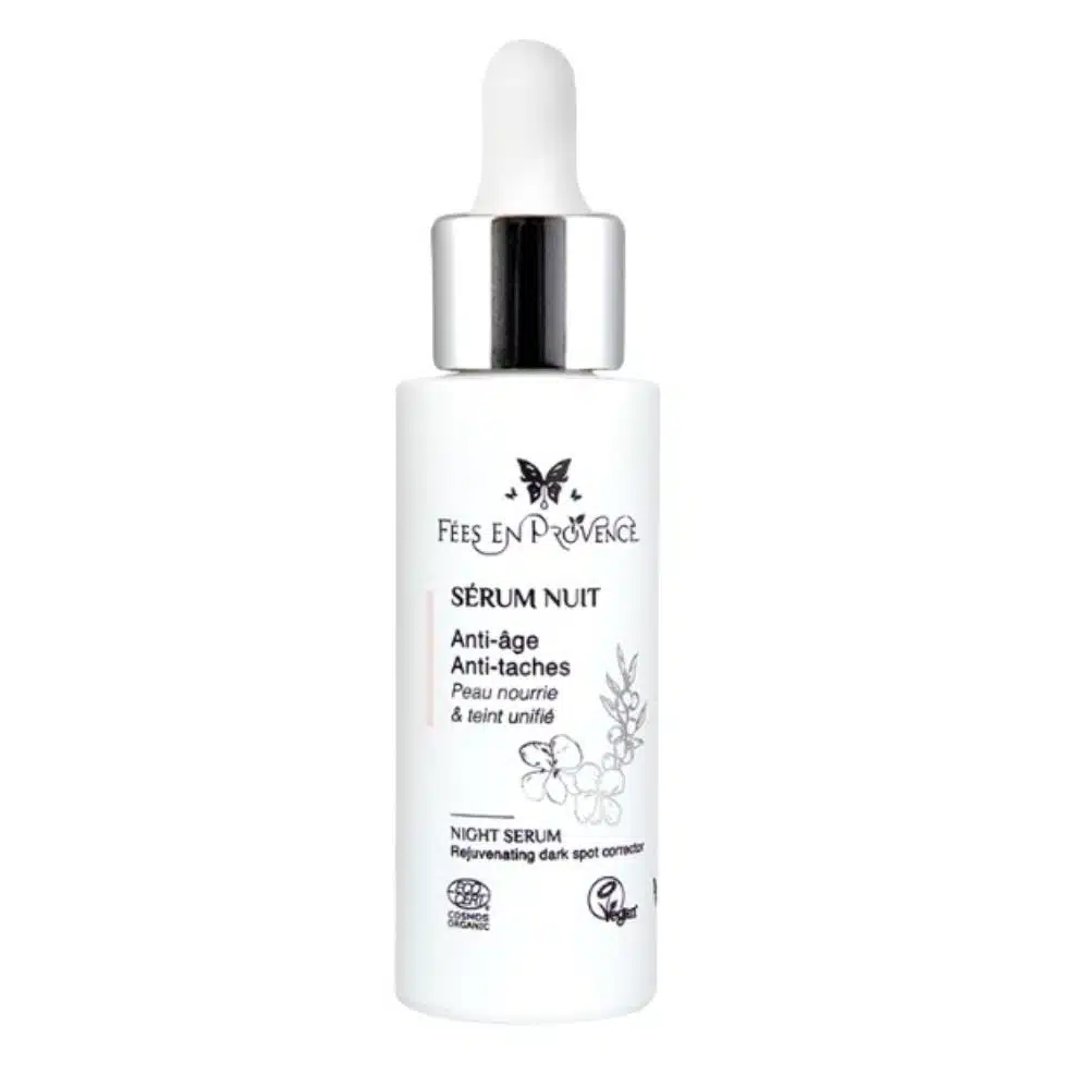 Le Sérum de nuit anti âge et anti tâche de Fées en Provence, riche en actifs botaniques concentrés, représente un précieux allié pour la préservation du capital jeunesse de la peau. Utilisé régulièrement, il favorise la fermeté de la peau et apporte une luminosité accrue au teint, nuit après nuit. Au cœur de sa formule, l’association d’Argousier et de Mauve bio de Provence offre une action anti-âge complète. Le complexe de Lys de mer et Narcisse des poètes cible l’éclaircissement de la peau, favorisant un teint uniforme et prévenant les taches pigmentaires. L’huile nourrissante de Grenade bio et l’extrait d’Algue brune bio agissent sur les rides et la fermeté, tandis que l’huile d’Argan bio, riche en vitamine E, régénère la peau en profondeur.