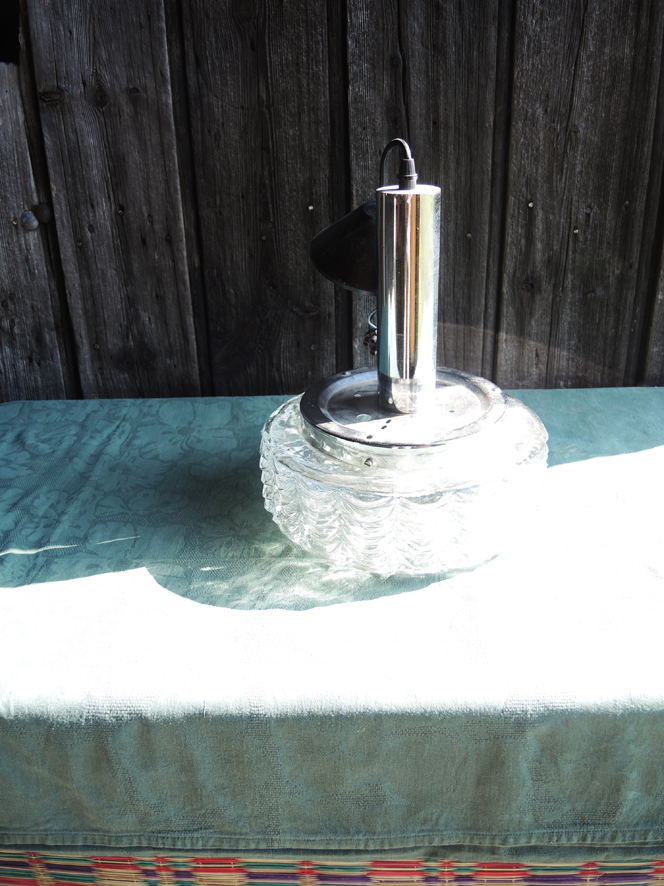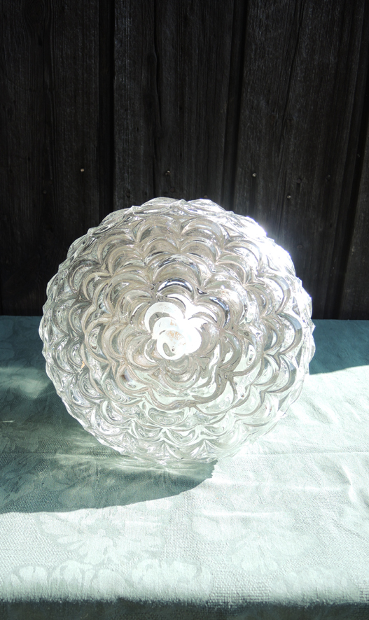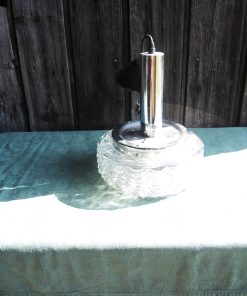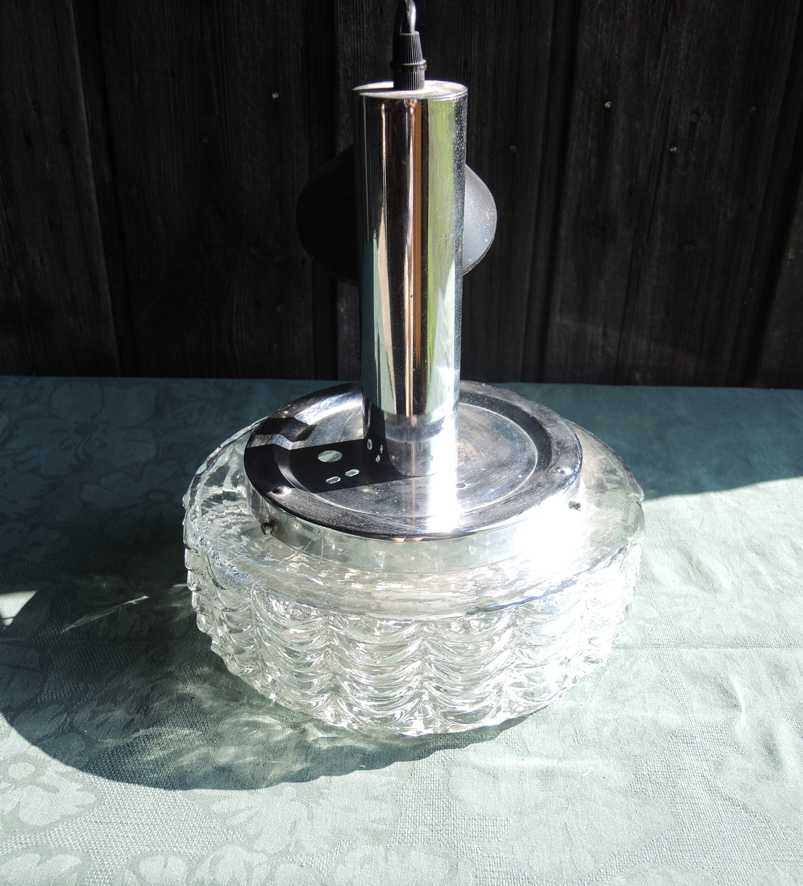 Ancienne suspension années 60-70 composée d’un support en métal chromé et d’un abat-jour en verre moulé transparent.