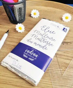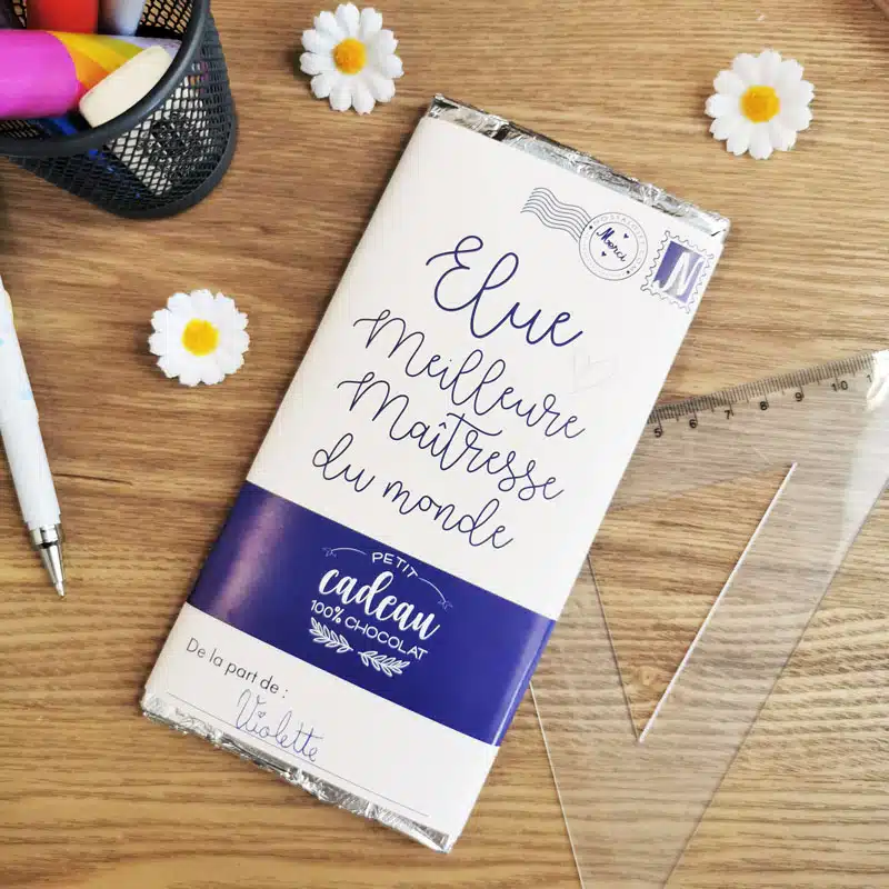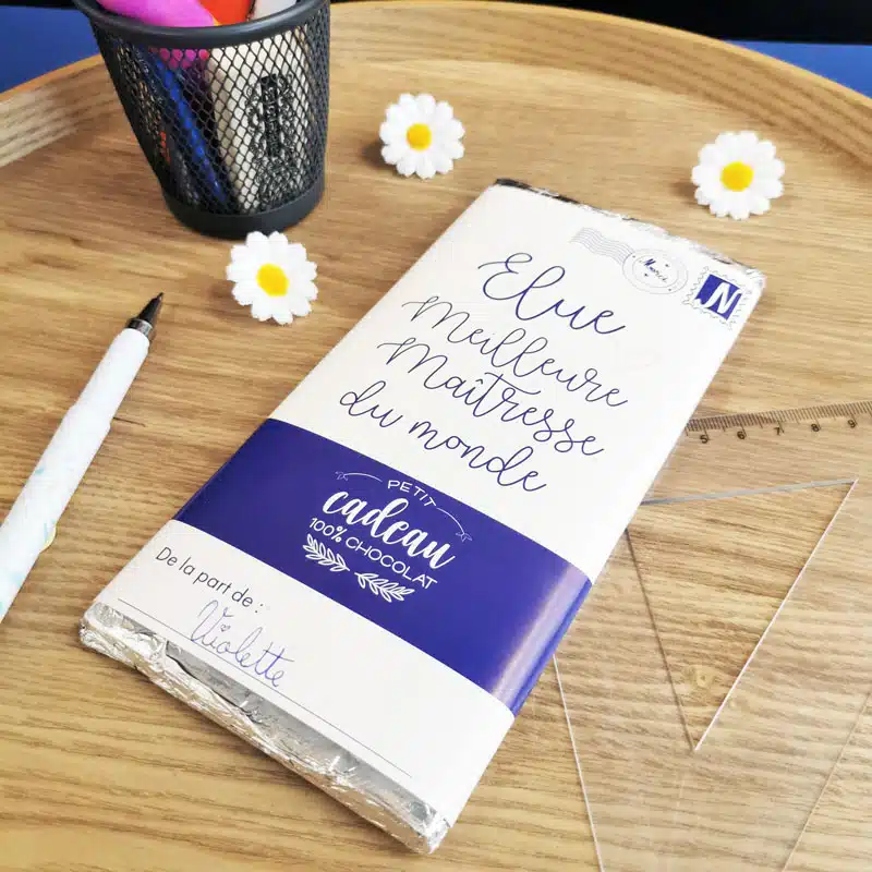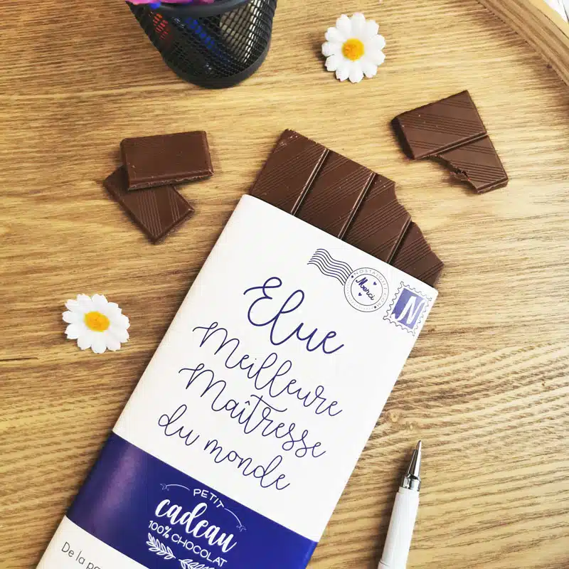 Tout le monde raffole du chocolat au lait et la maîtresse de votre enfant ne pourra qu’apprécier cette petite attention. Avec la mention “Elue meilleure maîtresse du monde“, cette tablette de chocolat de 100g est le cadeau idéal. Vous pourrez indiquer le prénom de votre enfant pour une attention toute particulière.