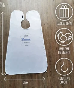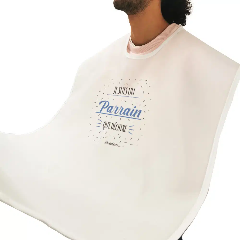 Offrez un cadeau pratique et original pour fêter un anniversaire ou Noël de votre parrain avec ce tablier à barbe sur lequel est écrit “Parrain qui déchire” avec des motif bleu sur l’avant.