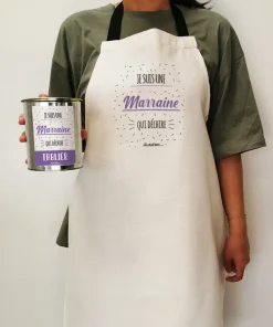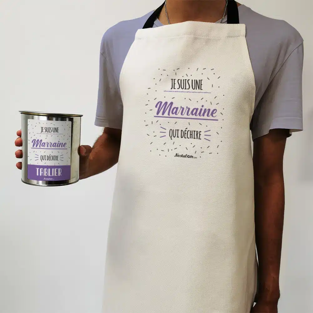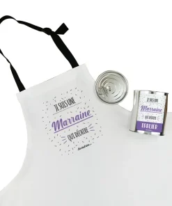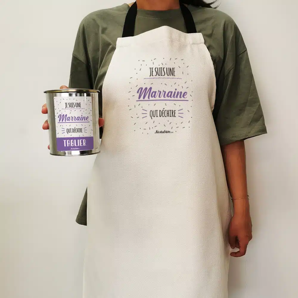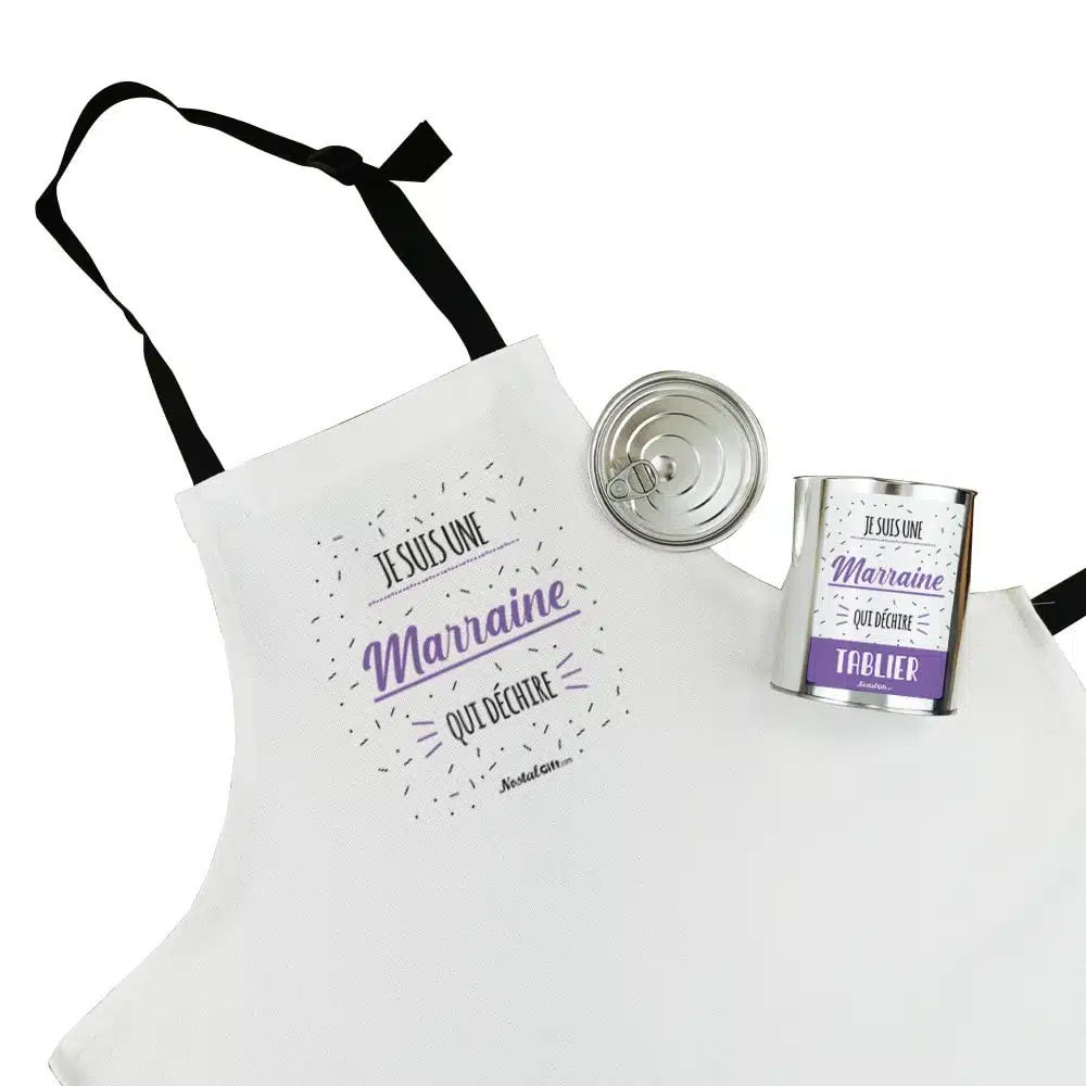 Tablier de cuisine dans sa boîte de conserve – “Je suis une une marraine qui déchire