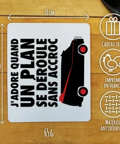 Offrez un cadeau pratique et original pour la fête des pères ou pour fêter un anniversaire avec ce tapis de souris rétro, sur lequel est écrit “J’adore quand un plan se déroule sans accroc” avec des motif rouge et noir sur l’avant. L’arrière de ce tapis de souris est noir et antidérapant. Avec ses dimensions de 19 x 23 cm, il est parfaitement adapté pour une utilisation confortable et précise lors de vos sessions de travail informatique ou de gaming.