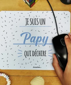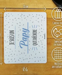 Offrez un cadeau pratique et original pour la fête des grands pères ou pour fêter un anniversaire avec ce tapis de souris original, sur lequel est écrit “Je suis un papy qui déchire” avec des motif bleu sur l’avant. L’arrière de ce tapis de souris est noir et antidérapant. Avec ses dimensions de 19 x 23 cm, il est parfaitement adapté pour une utilisation confortable et précise lors de vos sessions de travail informatique.