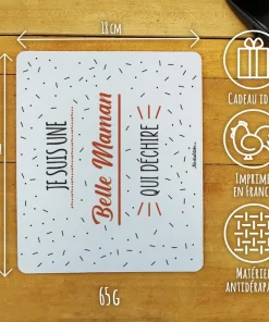 Offrez ce tapis de souris qui fait plaisir de notre collection “Qui déchire” . Offrez-le à votre belle mère à l’occasion de la la fête des mères ou fêter un anniversaire , c’est un cadeau rétro qui ravira vos votre belle mère ! Achetez le dès aujourd’hui pour recevoir votre cadeau prêt à offrir rapidement !