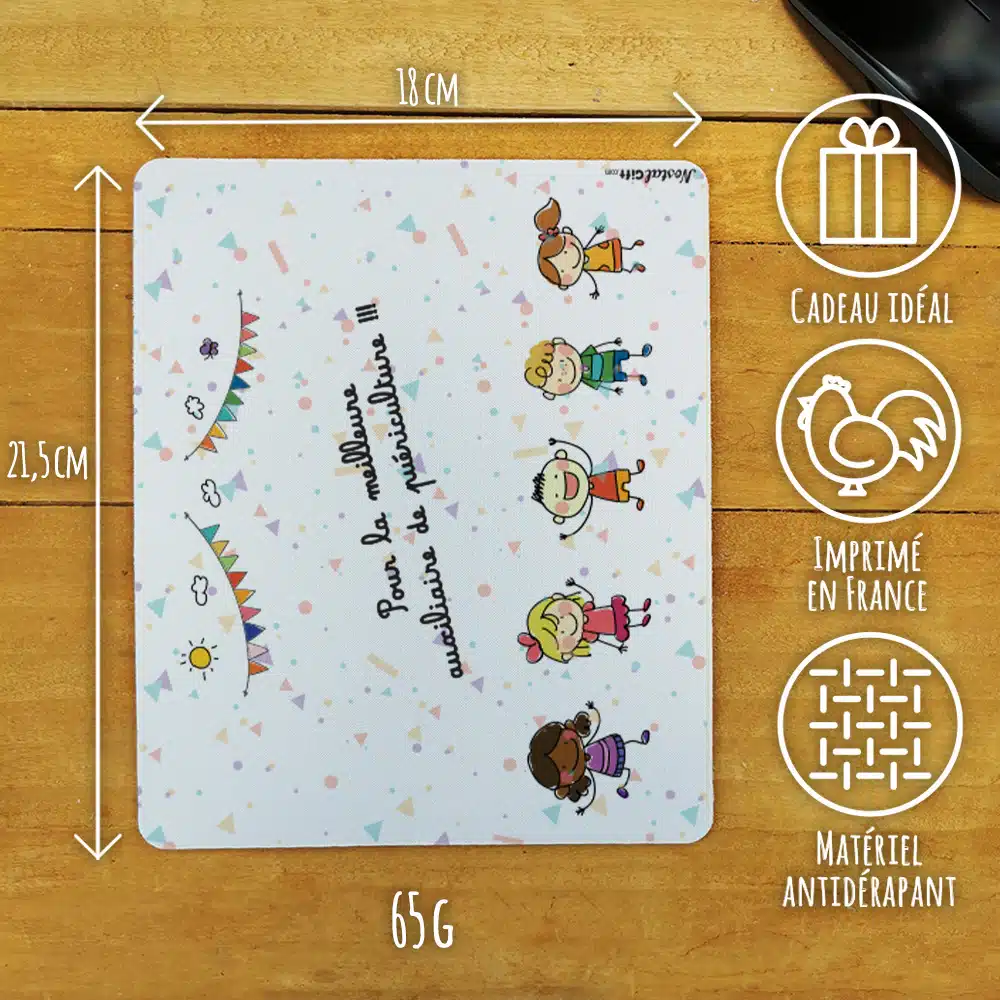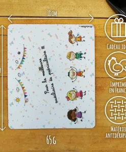 Offrez un cadeau pratique et original pour la fin de l’année scolaire avec ce tapis de souris rétro, sur lequel est écrit “Pour la meilleure auxiliaire de puériculture” avec des motif multicolore sur l’avant. L’arrière de ce tapis de souris est noir et antidérapant. Avec ses dimensions de 19 x 23 cm, il est parfaitement adapté pour une utilisation confortable et précise lors de vos sessions de travail informatique.