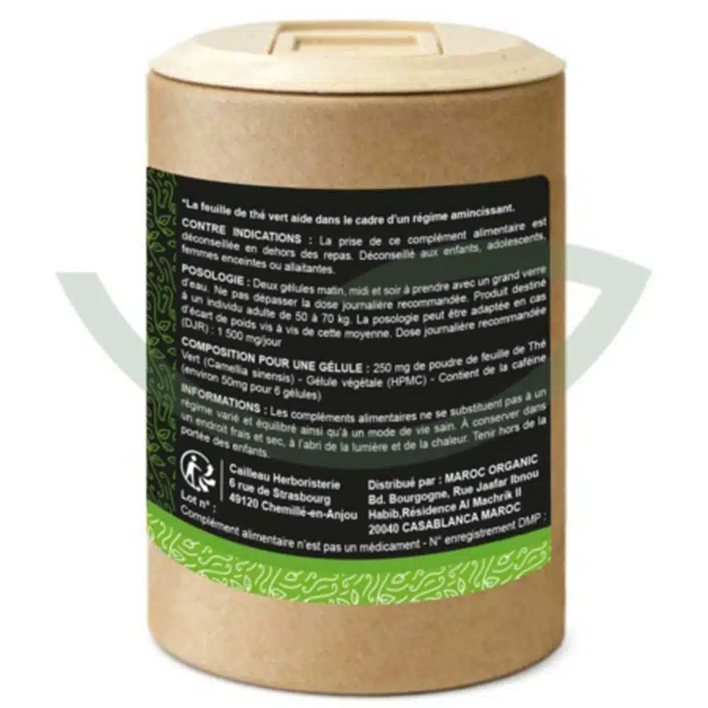 – 250 mg de poudre de feuille de Thé Vert (Camellia sinensis) – Gélule végétale (HPMC) – Contient de la caféine (environ 50mg pour 6 gélules)