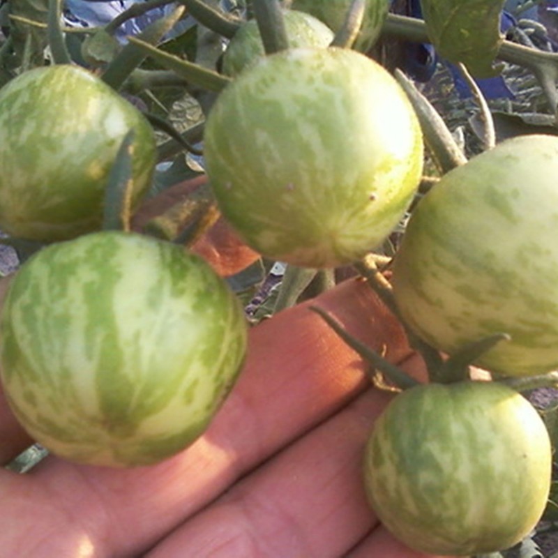 La tomate blanche Zébrée est de couleur crème avec des rayures vert pastel. C’est une tomate de mi-saison facile à cultiver. Les plantes mûrissent tard avec des rendements prolifiques de fruits savoureux ronds de 4 à 6 cm (1,5 à 2 po). La peau est lisse, la texture intérieure est ferme et pulpeuse. Les tomates Jaune Zébrée ont un goût riche et incroyable, généralement décrit comme sucré et complexe. Un favori des chefs gastronomiques.
