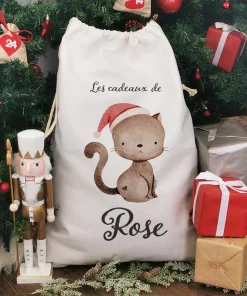 Hotte de Noël XXL personnalisée – “Les cadeaux de …” – Chat de Noël